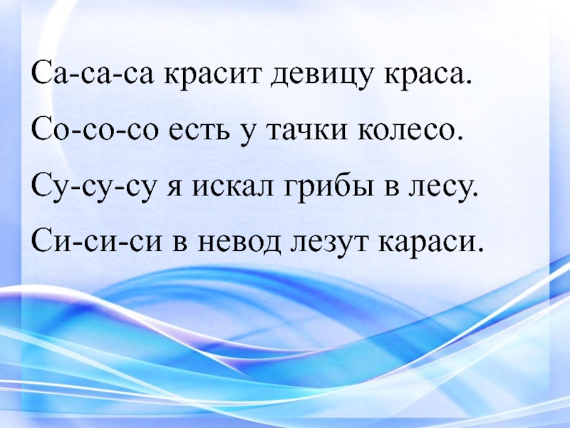 Са-са-са красит девицу краса.Со-со-со есть у тачки колесо. Су-су-су я искал грибы в лесу.Си-си-си в невод лезут
