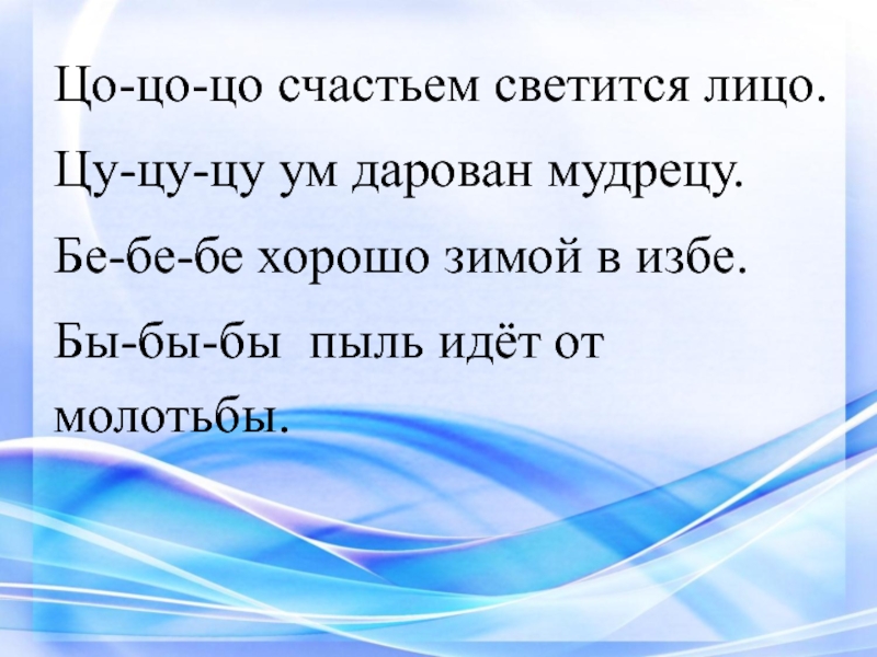 Цо-цо-цо счастьем светится лицо.Цу-цу-цу ум дарован мудрецу.Бе-бе-бе хорошо зимой в избе.Бы-бы-бы пыль идёт от молотьбы.