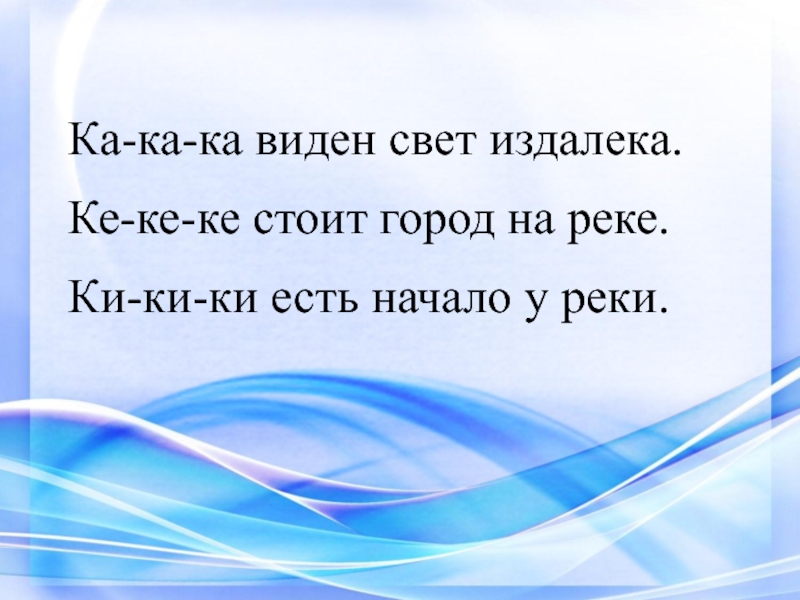 Ка-ка-ка виден свет издалека.Ке-ке-ке стоит город на реке.Ки-ки-ки есть начало у реки.