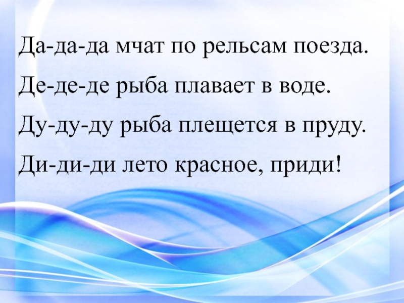 Да-да-да мчат по рельсам поезда.Де-де-де рыба плавает в воде.Ду-ду-ду рыба плещется в пруду.Ди-ди-ди лето красное, приди!