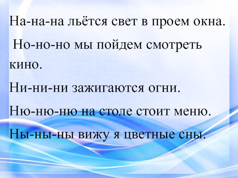 На-на-на льётся свет в проем окна. Но-но-но мы пойдем смотреть кино.Ни-ни-ни зажигаются огни.Ню-ню-ню на столе стоит меню.Ны-ны-ны
