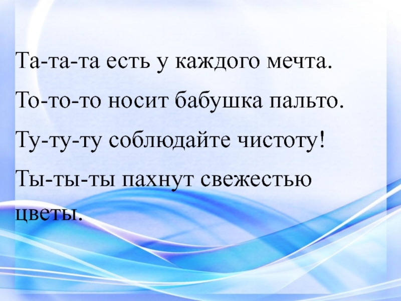 Та-та-та есть у каждого мечта.То-то-то носит бабушка пальто.Ту-ту-ту соблюдайте чистоту!Ты-ты-ты пахнут свежестью цветы.