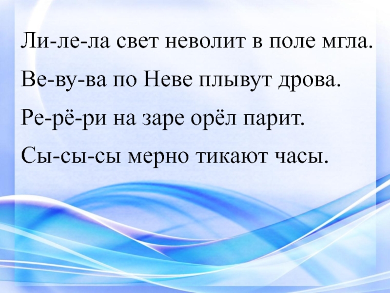 Ли-ле-ла свет неволит в поле мгла.Ве-ву-ва по Неве плывут дрова.Ре-рё-ри на заре орёл парит.Сы-сы-сы мерно тикают часы.