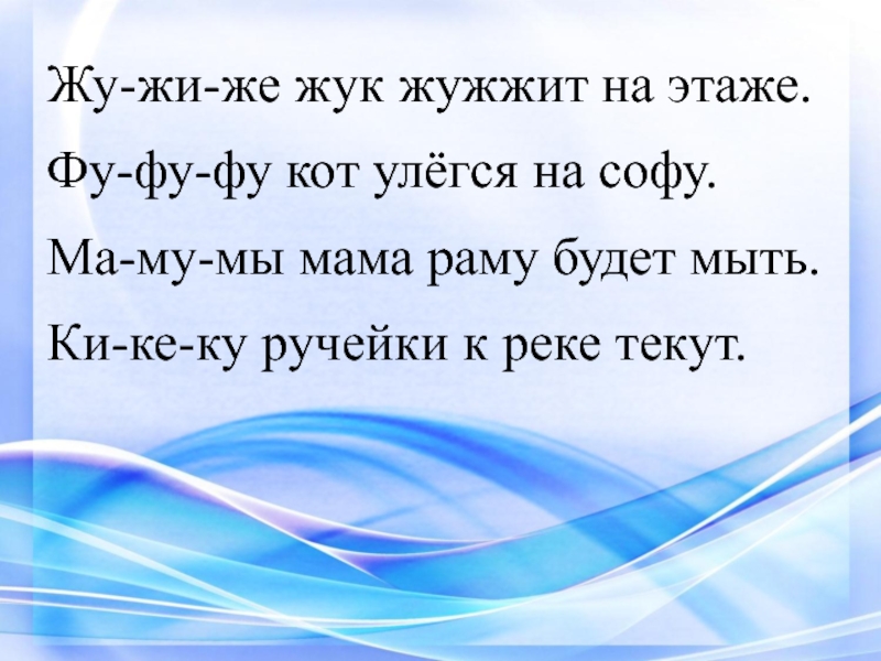 Жу-жи-же жук жужжит на этаже.Фу-фу-фу кот улёгся на софу.Ма-му-мы мама раму будет мыть.Ки-ке-ку ручейки к реке текут.