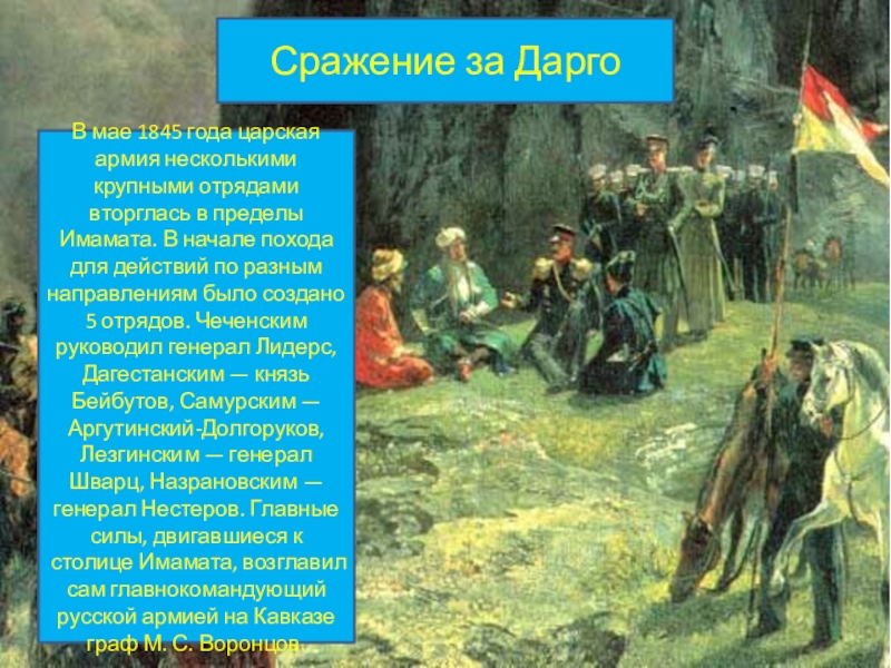 вторглась в пределы Имамата. В начале похода для действий по разным направлениям было создано 5 отрядов. Чеченским руководил генерал Лидерс, Дагестанским — князь Бейбутов, Самурским — Аргутинский-Долгоруков, Лезгинским — генерал Шварц, Назрановским — генерал Нестеров. Главные силы, двигавшиеся к столице Имамата, возглавил сам главнокомандующий русской армией на Кавказе граф М. С. Воронцов.
