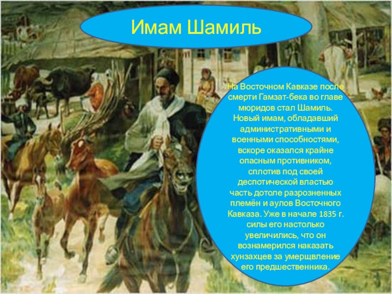 Шамиль. Новый имам, обладавший административными и военными способностями, вскоре оказался крайне опасным противником, сплотив под своей деспотической властью часть дотоле разрозненных племён и аулов Восточного Кавказа. Уже в начале 1835 г. силы его настолько увеличились, что он вознамерился наказать хунзахцев за умерщвление его предшественника.