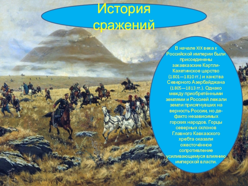 Картли-Кахетинское царство (1801—1810 гг.) и ханства Северного Азербайджана (1805—1813 гг.). Однако между приобретёнными землями и Россией лежали земли присягнувших на верность России, но де-факто независимых горских народов. Горцы северных склонов Главного Кавказского хребта оказали ожесточённое сопротивление усиливающемуся влиянию имперской власти.
