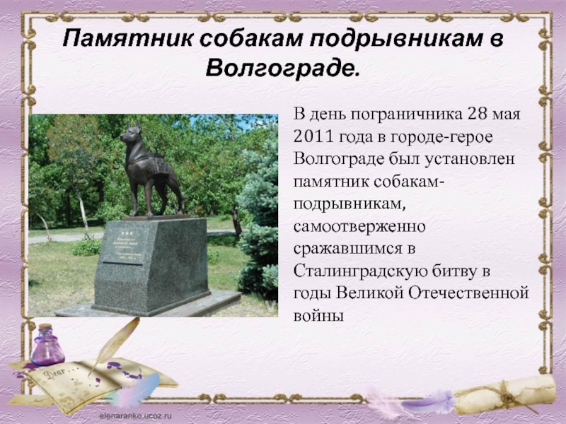 в городе-герое Волгограде был установлен памятник собакам-подрывникам, самоотверженно сражавшимся в Сталинградскую битву в годы Великой Отечественной войны