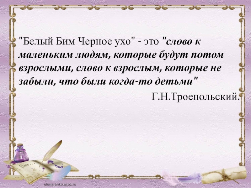 Слайд 41"Белый Бим Черное ухо" - это "слово к маленьким людям, которые будут потом взрослыми,