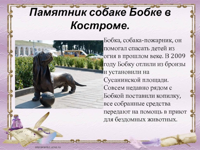 Слайд 59Памятник собаке Бобке в Костроме.
