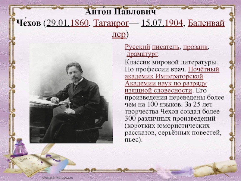 профессии врач. Почётный академик Императорской Академии наук по разряду изящной словесности. Его произведения переведены более чем на 100 языков. За 25 лет творчества Чехов создал более 300 различных произведений (коротких юмористических рассказов, серьёзных повестей, пьес).