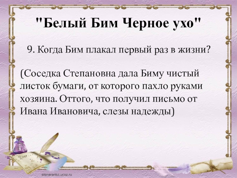 (Соседка Степановна дала Биму чистый листок бумаги, от которого пахло руками хозяина. Оттого, что получил письмо от Ивана Ивановича, слезы надежды)