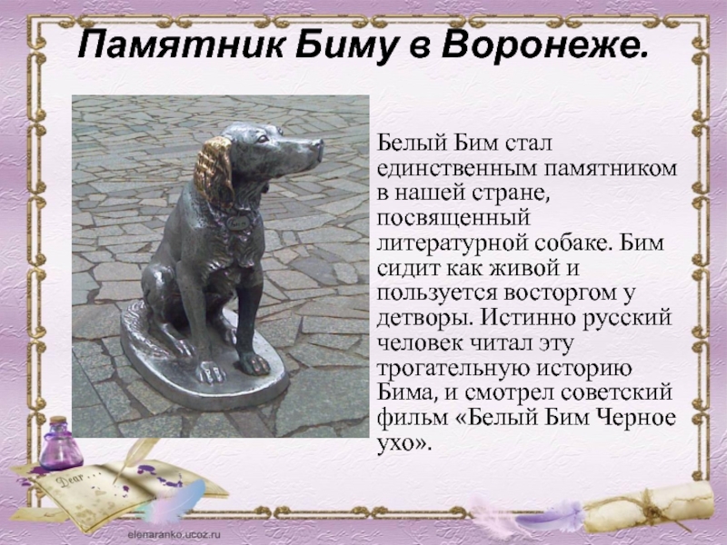 посвященный литературной собаке. Бим сидит как живой и пользуется восторгом у детворы. Истинно русский человек читал эту трогательную историю Бима, и смотрел советский фильм «Белый Бим Черное ухо».