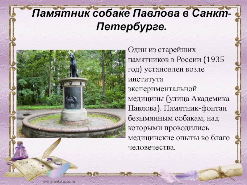 год) установлен возле института экспериментальной медицины (улица Академика Павлова). Памятник-фонтан безымянным собакам, над которыми проводились медицинские опыты во благо человечества.
