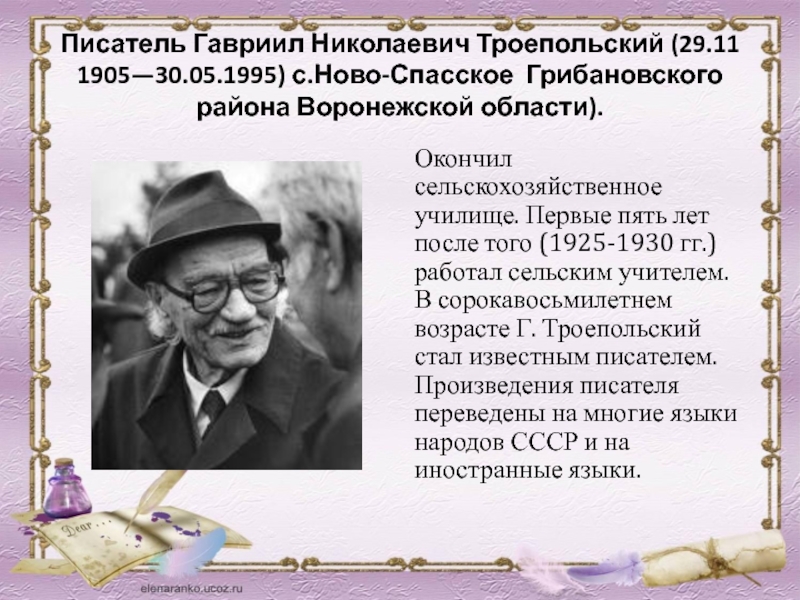 Слайд 40Писатель Гавриил Николаевич Троепольский (29.11 1905—30.05.1995) с.Ново-Спасское Грибановского района Воронежской области).