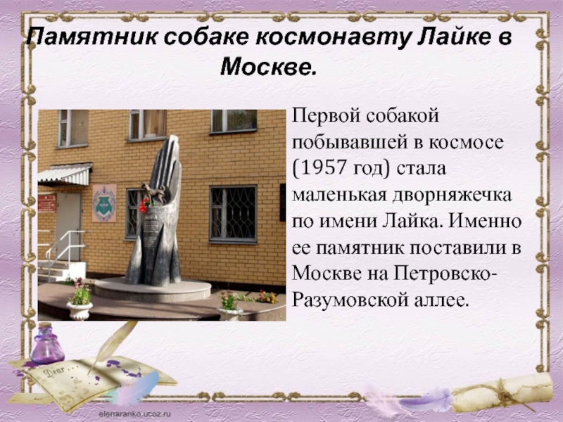 Слайд 60Памятник собаке космонавту Лайке в Москве.