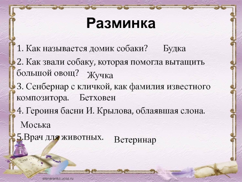 15. Клички собак—героев мультфильма, в котором один из них пригласил другого в гости, пока дедушки не было дома.