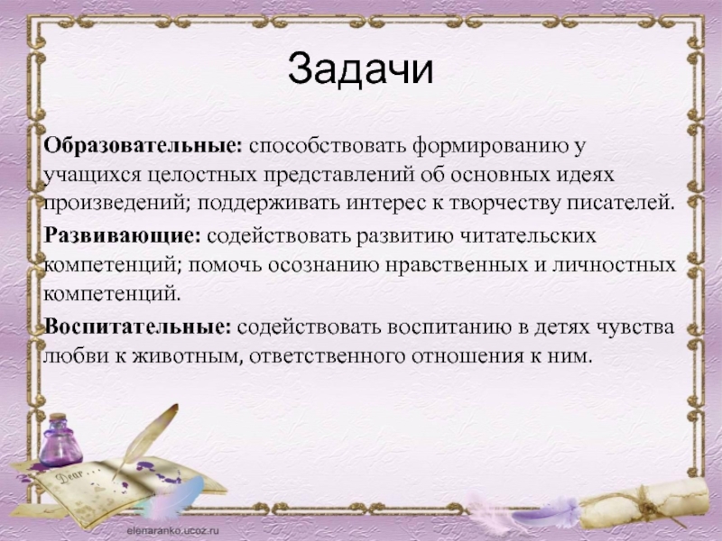Развивающие: содействовать развитию читательских компетенций; помочь осознанию нравственных и личностных компетенций.