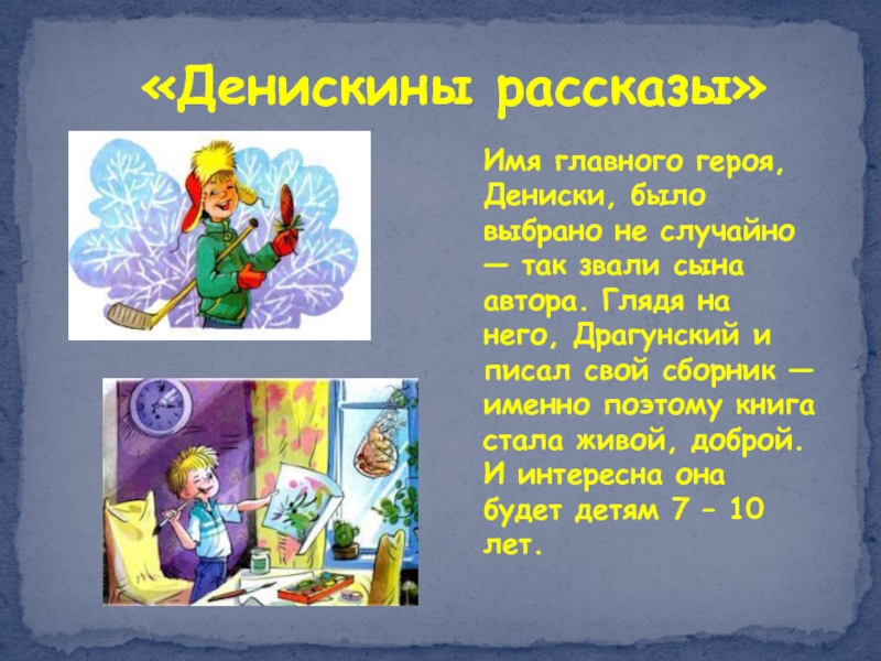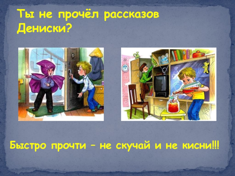 Вместе со своими друзьями, Мишкой и Алёнкой, Дениска проказничает и хулиганит, играет, узнает что-то новое, растет — в общем, занимается обыкновенными детскими делами.