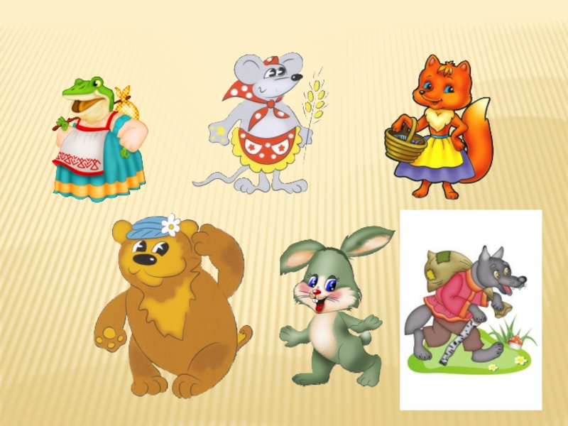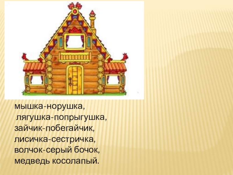 мышка-норушка, лягушка-попрыгушка, зайчик-побегайчик, лисичка-сестричка, волчок-серый бочок, медведь косолапый.