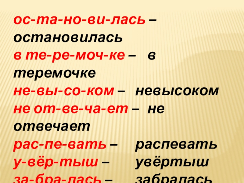 ос-та-но-ви-лась –остановиласьв те-ре-моч-ке – 	в теремочкене-вы-со-ком – 	невысокомне от-ве-ча-ет – 	не отвечаетрас-пе-вать – 		распеватьу-вёр-тыш – 		увёртышза-бра-лась –