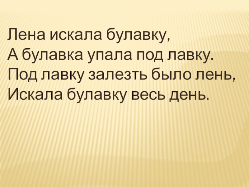 Лена искала булавку,А булавка упала под лавку.Под лавку залезть было лень,Искала булавку весь день.