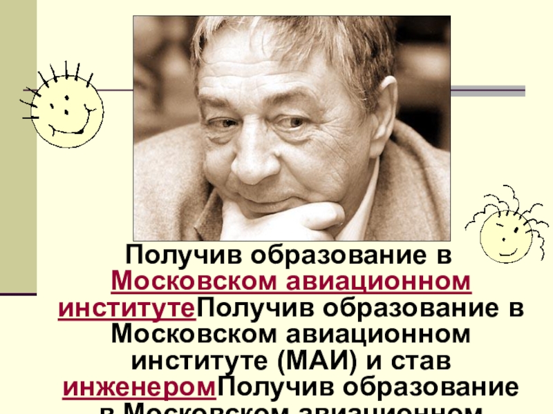 авиационном институте (МАИ) и став инженеромПолучив образование в Московском авиационном институте (МАИ) и став инженером, он зарабатывал на жизнь тем, что писал и создавал мультфильмы.