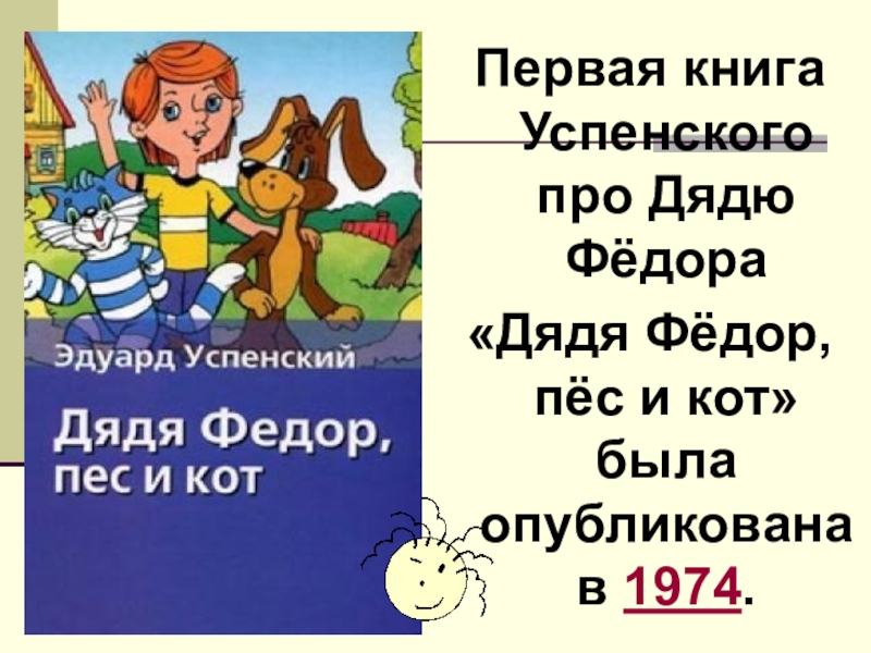 Первая книга Успенского про Дядю Фёдора «Дядя Фёдор, пёс и кот» была опубликована в 1974.