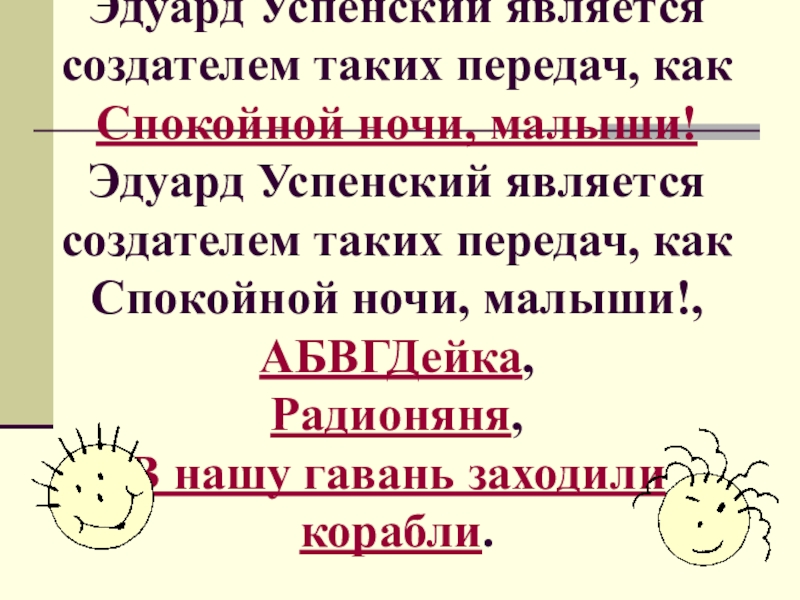 Слайд 13Эдуард Успенский является создателем таких передач, как Спокойной ночи, малыши!Эдуард Успенский