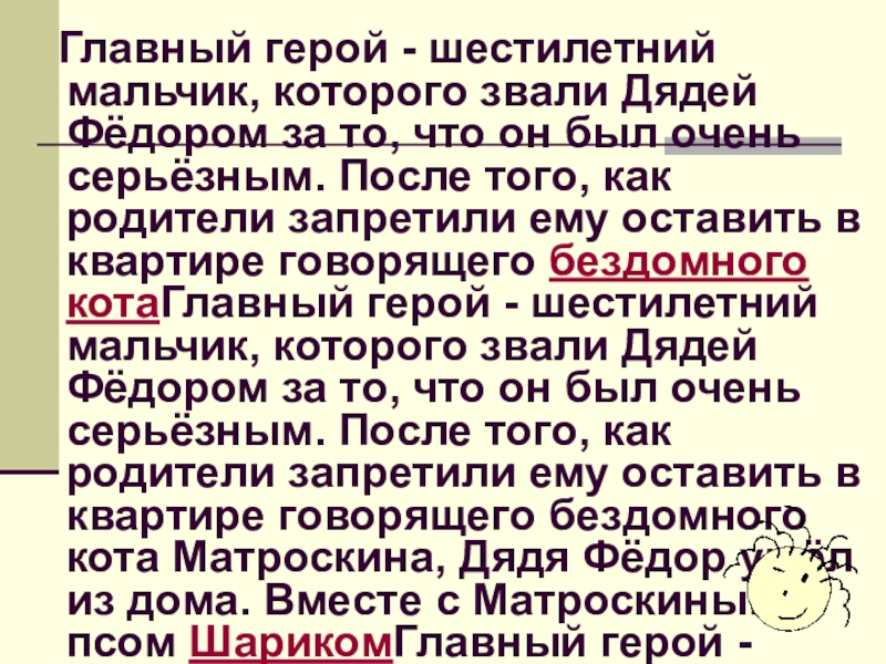 Слайд 7 Главный герой - шестилетний мальчик, которого звали Дядей Фёдором