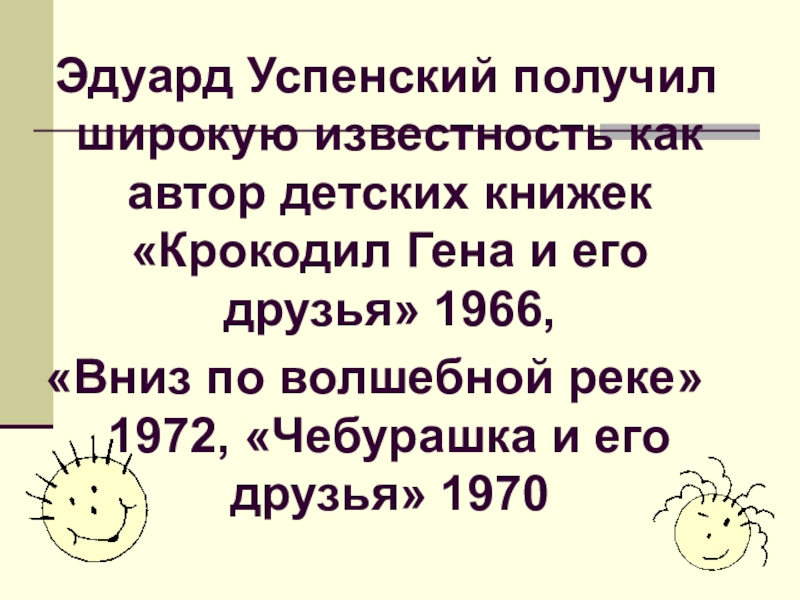 Эдуард Успенский получил широкую известность как автор детских книжек «Крокодил Гена и его друзья» 1966,