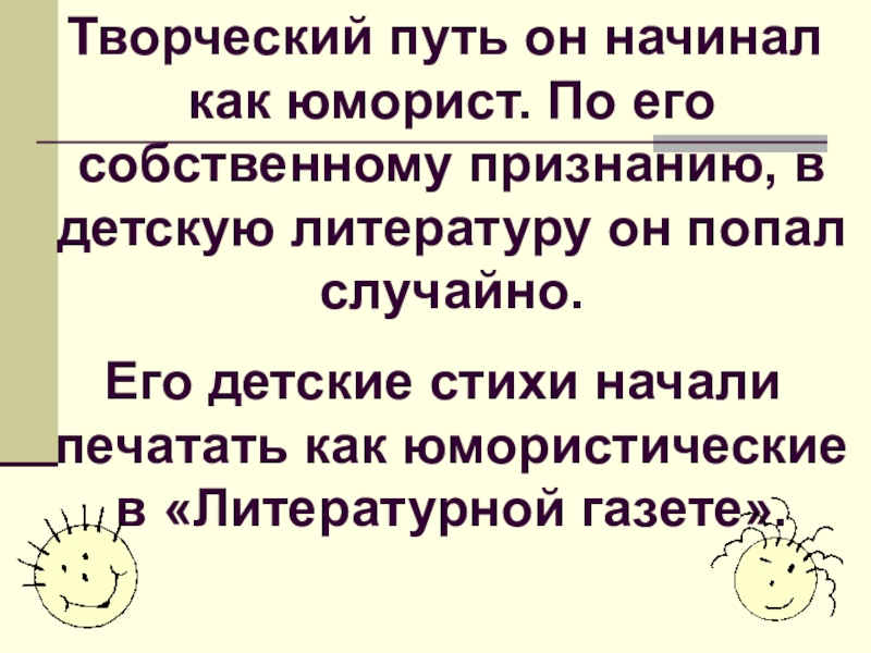 Его детские стихи начали печатать как юмористические в «Литературной газете».