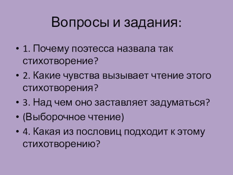 Вопросы и задания:1. Почему поэтесса назвала так стихотворение?2. Какие чувства вызывает чтение этого стихотворения?3. Над чем оно