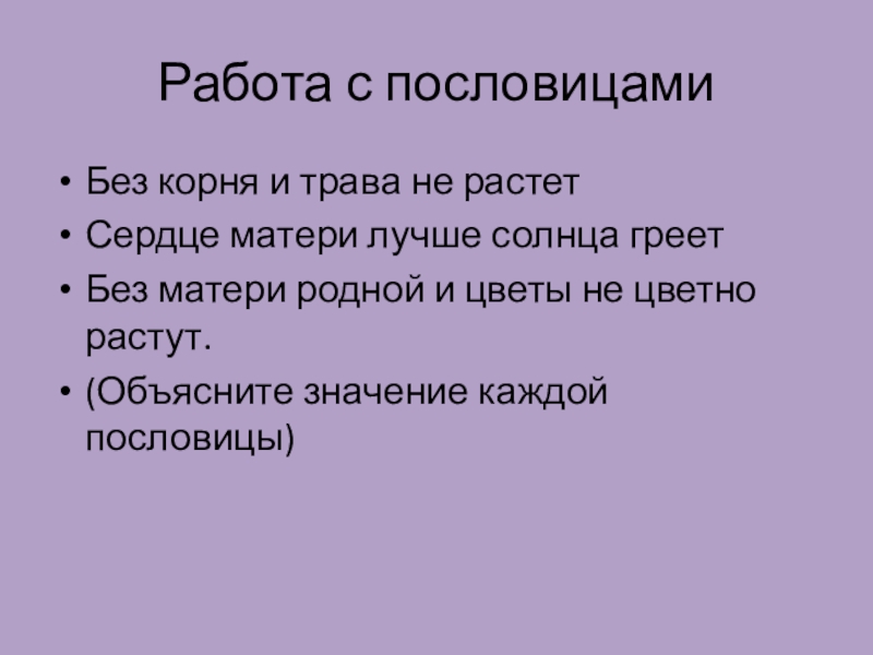 Работа с пословицамиБез корня и трава не растетСердце матери лучше солнца греетБез матери родной и цветы не