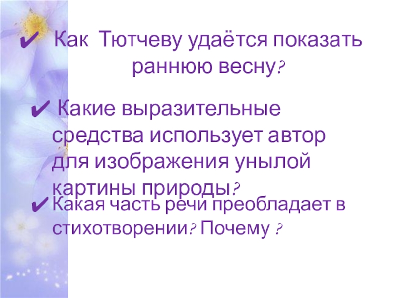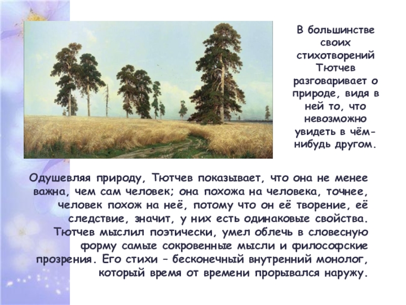 В большинстве своих стихотворений Тютчев разговаривает о природе, видя в ней то, что невозможно увидеть в чём-нибудь другом.
