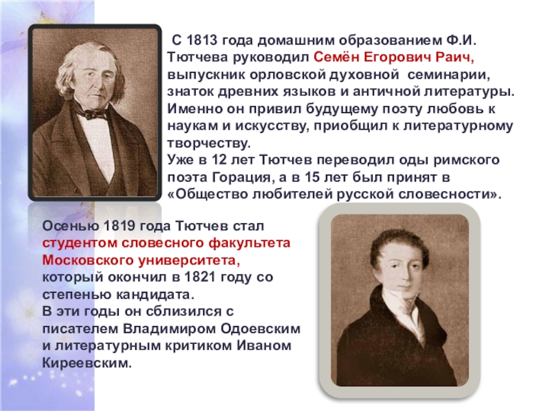 Осенью 1819 года Тютчев стал студентом словесного факультета Московского университета,