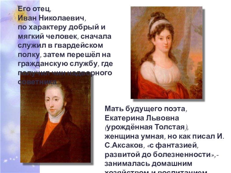 женщина умная, но как писал И.С.Аксаков, «с фантазией, развитой до болезненности»,- занималась домашним хозяйством и воспитанием сына.