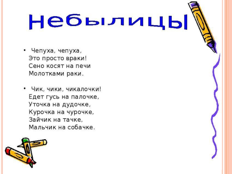 Слайд 13Небылицы – вымысел , лживое сообщение , враньё.