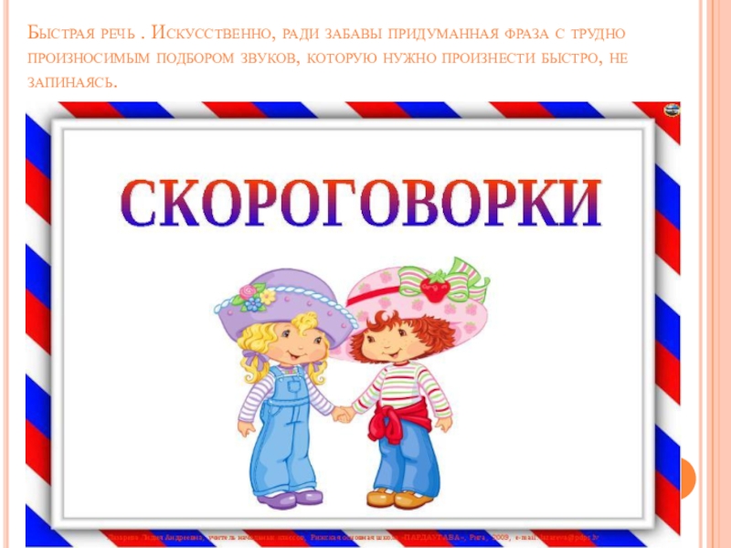 Слайд 6Быстрая речь . Искусственно, ради забавы придуманная фраза с трудно произносимым