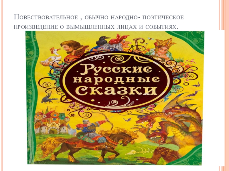 Слайд 15Повествовательное , обычно народно- поэтическое произведение о вымышленных лицах и событиях.