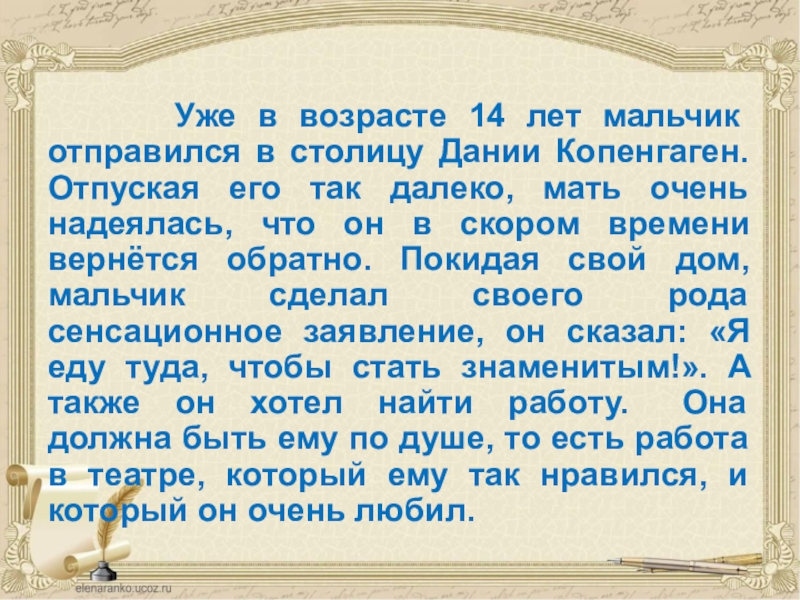 В раннем детстве Ганс Христиан был замкнутым ребёнком с большими голубыми глазами, который сидел в углу и играл в свою любимую игру — кукольный театр. Кукольным театром Андерсен увлекался и позднее.