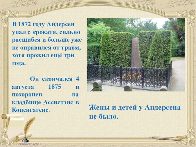 Жены и детей у Андерсена не было.