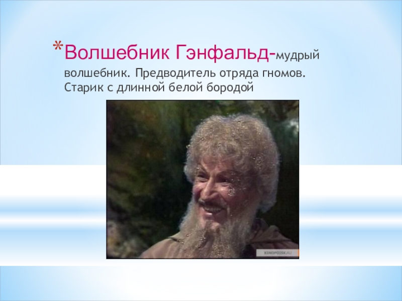 Слайд 7Волшебник Гэнфальд-мудрый волшебник. Предводитель отряда гномов. Старик с длинной белой бородой