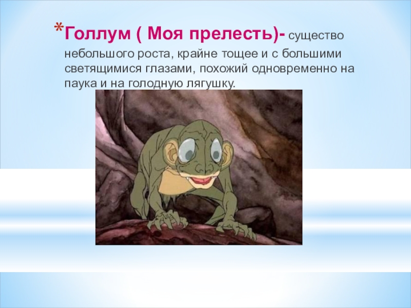 Голлум ( Моя прелесть)- существо небольшого роста, крайне тощее и с большими светящимися глазами, похожий одновременно на