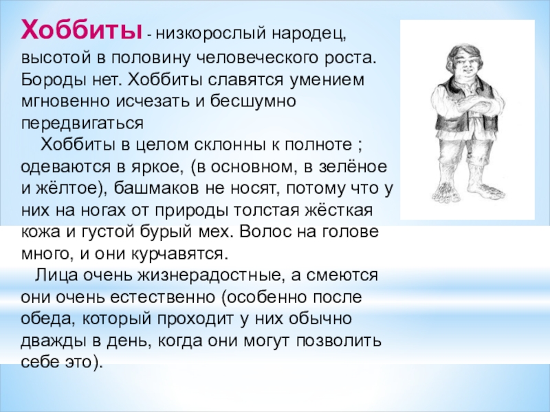Слайд 3Хоббиты - низкорослый народец, высотой в половину человеческого роста.