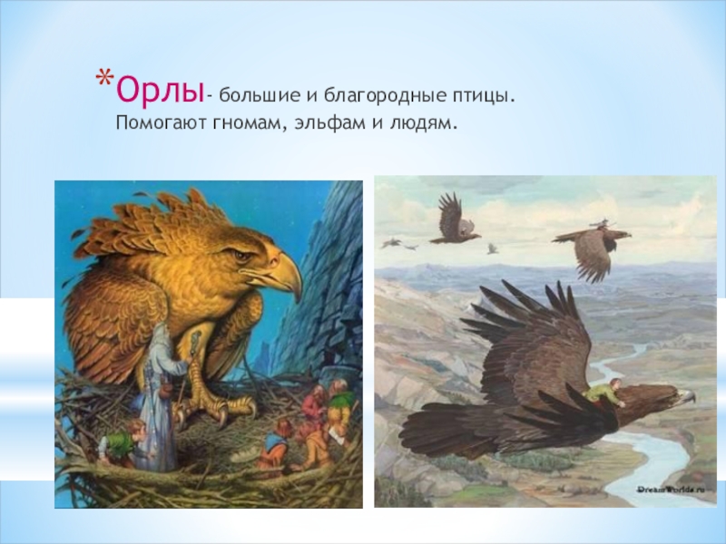 Орлы- большие и благородные птицы. Помогают гномам, эльфам и людям.