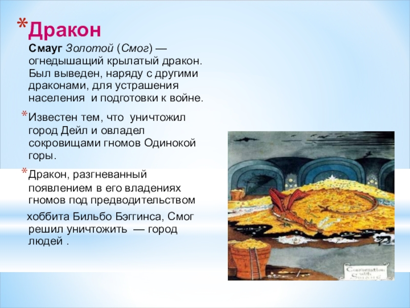 Слайд 13Дракон Смауг Золотой (Смог) — огнедышащий крылатый дракон. Был выведен, наряду с другими драконами, для