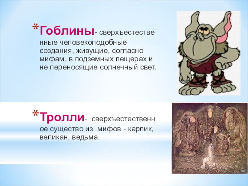 Гоблины- сверхъестественные человекоподобные создания, живущие, согласно мифам, в подземных пещерах и не переносящие солнечный свет. Тролли-  сверхъестественное существо
