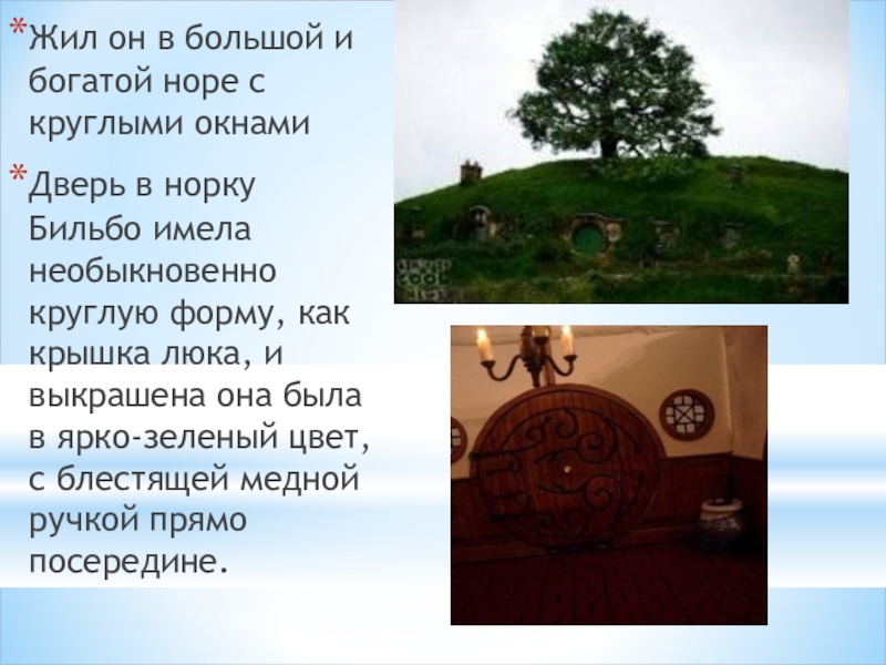 Слайд 4Жил он в большой и богатой норе с круглыми окнами