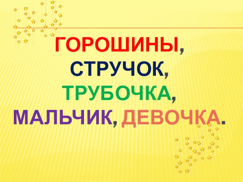Слайд 9Горошины, стручок, трубочка, мальчик, девочка.